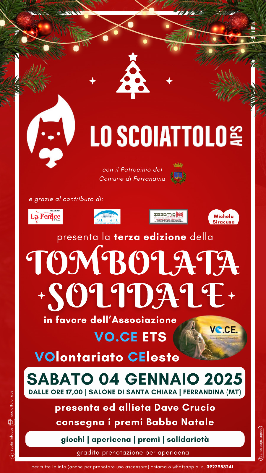 Voce.it - Home Page Vo.Ce. è un’associazione di volontariato nata nel 2009 a Matera dalla tenacia e dal coraggio della famiglia di Costanza Celeste Tralli, una giovane materana nata al cielo il 7 novembre 2008 per un’imperdonabile leucemia acuta. Il progetto di vita di Costanza Celeste era quello di dedicarsi agli altri, di svolgere una professione di relazione di aiuto, di impegnarsi nel Volontariato e nel Sociale. Pertanto, la sua famiglia ha raccolto la sua eredità e ha voluto realizzare il sogno d’Amore di Costanza Celeste nella Casa di Accoglienza che porta il suo nome. Vo.Ce.è una grande famiglia composta da tantissimi giovani volontari che, condividendo la forza dell’Amore gratuito, della Fede che si fa opera, della Generosità senza frontiere, trovano coraggio e forza per offrire concretamente accoglienza, ospitalità, sostegno psico-relazionale-affettivo ai malati e ai loro familiari che giungono a Matera per curarsi nell’ospedale Santa Maria delle Grazie. Notizie « Indietro Tombolata solidale in favore di VO. CE. - 4 gennaio 2025L'Associazione LO SCOIATTOLO di Ferrandina organizza per piccoli ed adulti una tombolata solidale in favore di VO.CE. il 4/01/2025. Babbo Natale consegnerà i premi per la gioia dei bimbi. L'unico costo è di 10 euro (3 cartelle della Tombola + eventuali premi + apericena) Chi fosse interessato può contattare il sign. Fabio al n° 3290703770 per informazioni e prenotazioni. |